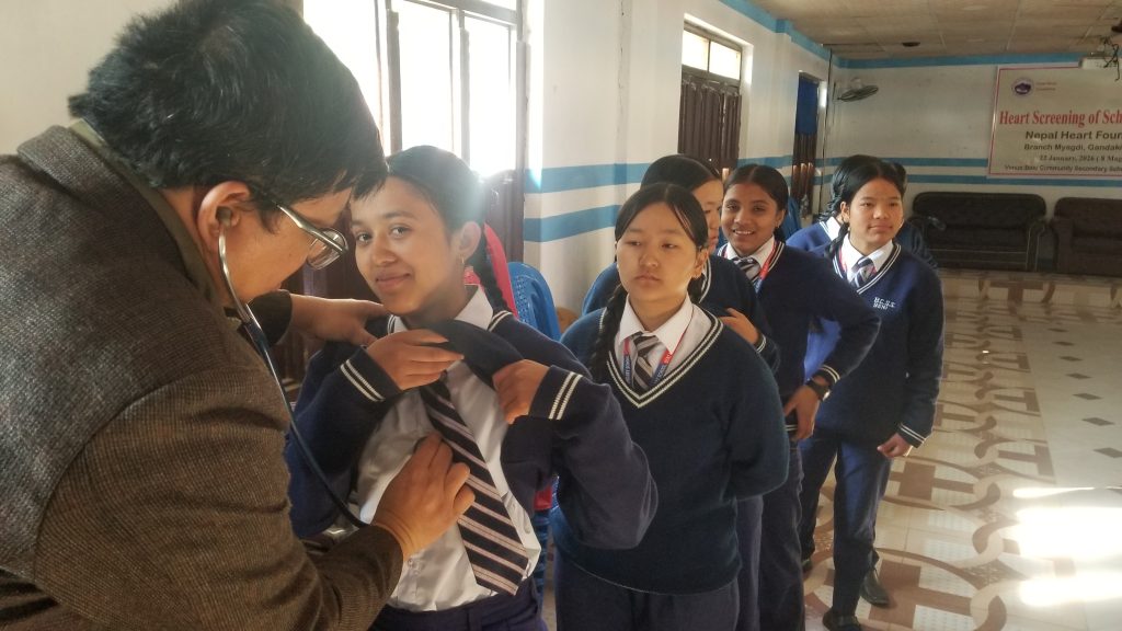 Under this partnership, a total of 9,591 students from 25 schools were screened using stethoscopes to detect abnormal heart murmurs. District-wise coverage included 3,006 students from 11 schools in Syangja, 3,562 students from 6 schools in Parbat, and 3,023 students from 8 schools in Myagdi. Students suspected of having cardiac abnormalities were further evaluated using portable echocardiography, with 911 students undergoing detailed diagnostic assessment.